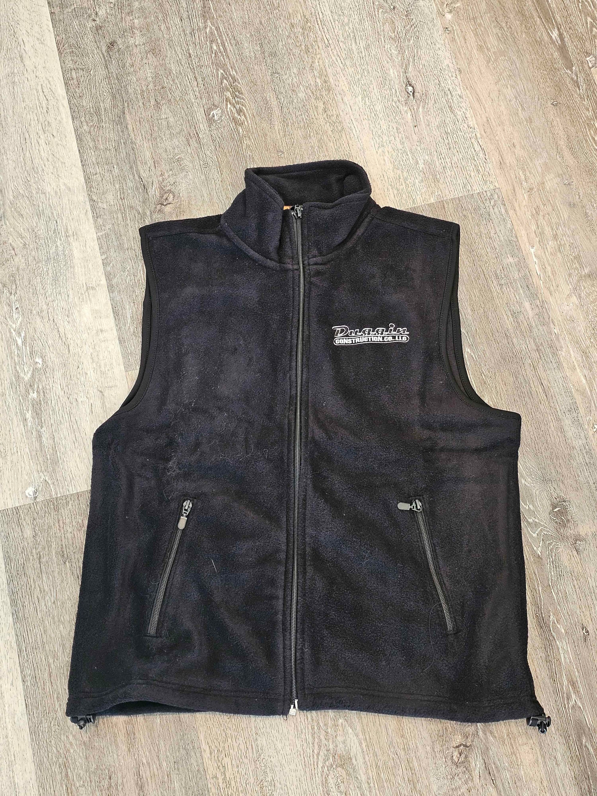 Black zip-up fleece vest with white Duggin logo embroidered on left side.